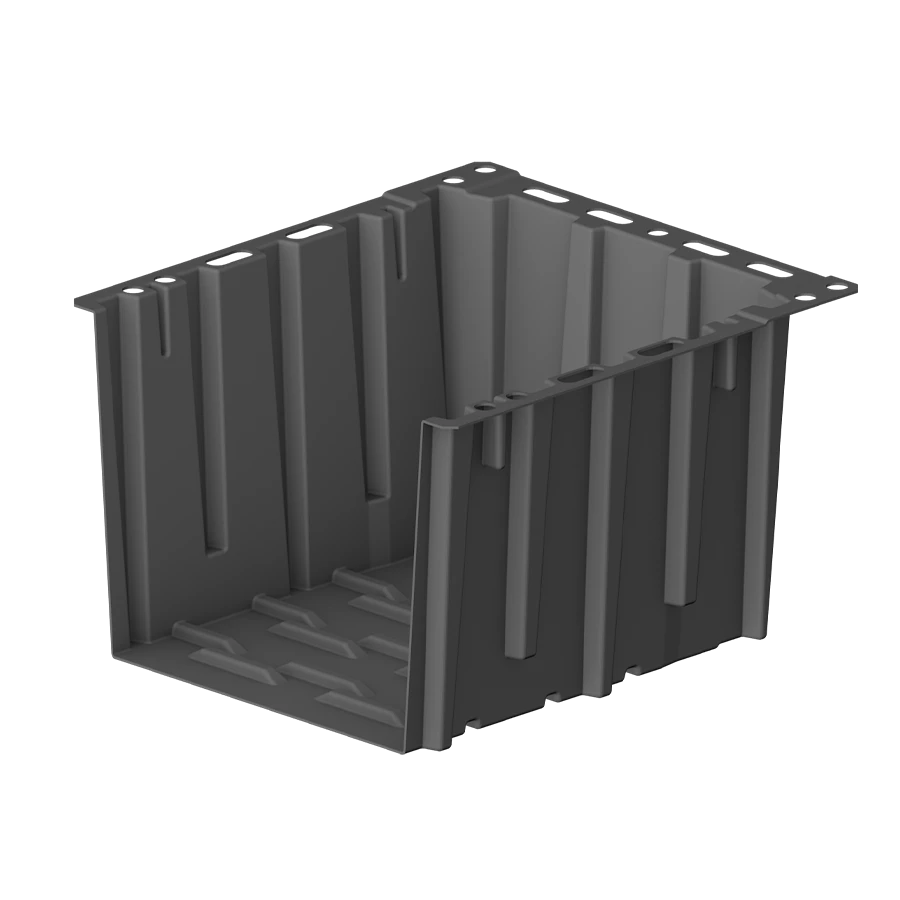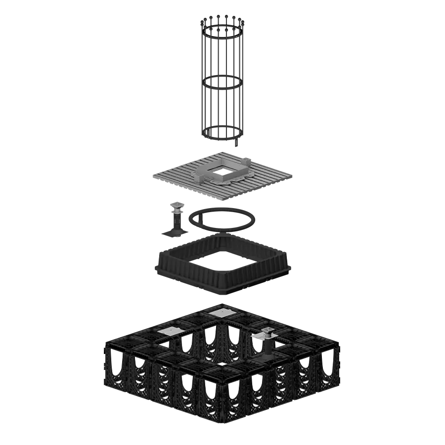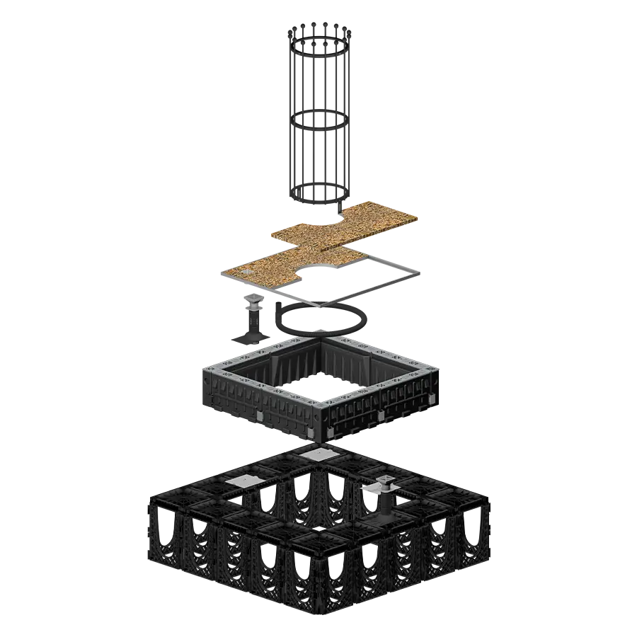 Modulare Pflanzgefäße mit internem Speichervolumen, Unterdrainagen und gedrosseltem Ablauf – geeignet für standortbedingt beengte oder leitungsdichte Bereiche.