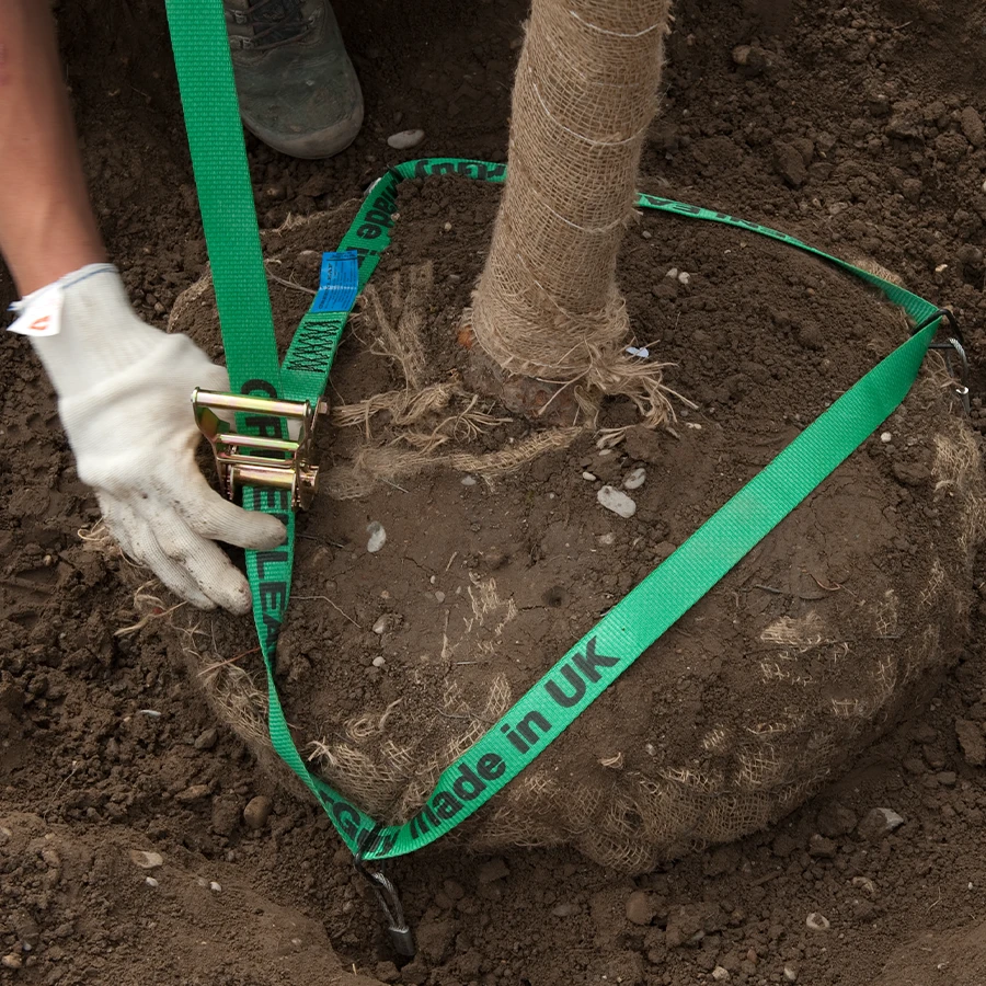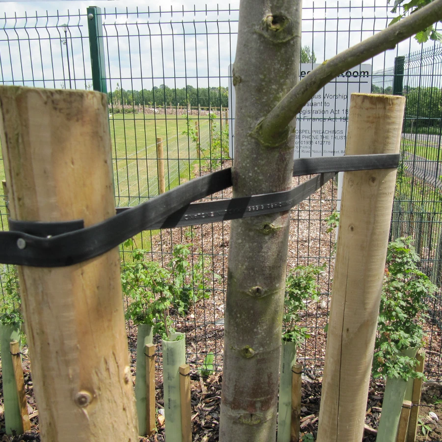 Nylonverstärkte Gummibänder in verschiedenen Größen sowie Jutebänder des Typs NatureTie, die sich während der Etablierungsphase des Baumes biologisch zersetzen.