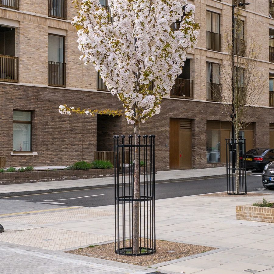Stadtbäume sind vielfältigen Belastungen ausgesetzt – durch Fahrräder, Tiere, Fahrzeuge und öffentliche Nutzung. Schutzvorrichtungen bilden eine robuste Barriere um junge Stämme, verringern Schäden und helfen den Bäumen, ein stabiles Wachstumsstadium zu erreichen.